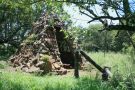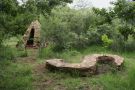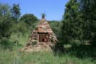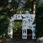 Working with the idea of the historical English Landscape Garden, where ruins often had critical political impacts expressing the rebellious opinion of the garden-owners through architectonical representations of a “better past”, I have constructed an artificial ruin titled “Jardins d’amis – The Gate in Ruin (SAN)”. Oscillating between a sculpture, a garden-architecture and text written on the ground, I am taking a wider perspective, though, going back to our origin, not only to the Western World’s origin, but to the “Cradle of Humankind”, in particular to our DNA and in consequence to the SAN people. They are supposed to be the first branch of the human genealogical tree from which all other humans have spread over the globe. My research of the SAN has led to a deepened understanding of the contradiction of their place as our genetic origin and the racist treatment of the few surviving SAN groups pushed to the Kalahari-Desert.