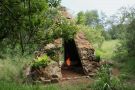 I emphasize these contradictions by writing” the word SAN in two different ways on the ground, with architecture and light, gaining and loosing its readability as the visitor and the sunlight are moving on. As for the architecture, its three letters S A N are built out of used construction-material, natural stones from the bush-land around and specific plants chosen by gardeners of the foundation (Michael Mlaula and others) who have helped to build the art-work. Their participation is part of the concept of the creation and they are invited to take care of the work and the plants now and in the future.